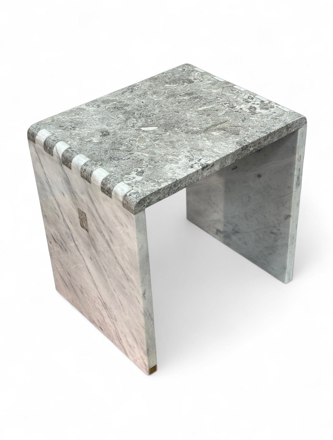 A table crafted from Carrara and Tundra grey marble, treated with a joinery function, featuring a modern smooth design.